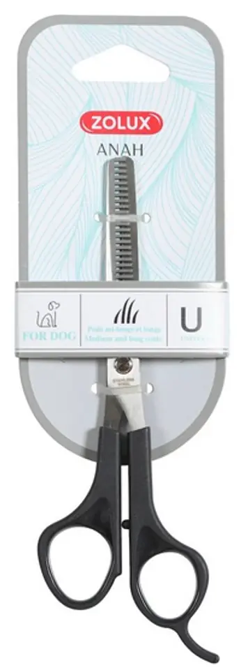 ZOLUX ANAHPrezentujemy nową, kompletną gamę produktów do pielęgnacji ANAH, stworzoną w odpowiedzi na wszystkie potrzeby psów i kotów.Zaprojektowaliśmy nowy uchwyt, który zapewnia większą wygodę użytkowania i idealnie leży w dłoni, dzięki ergonomicznemu kształtowi, miękkiemu i przyjemnemu w dotyku wykończeniu SOFT TOUCH oraz powłoce z gumy termoplastycznej i miękkim wypustkom. Dodatkowo, niezależnie od rozmiaru produktu, uchwyt ma jeden rozmiar, który idealnie leży w dłoni.Produkty zaprojektowano w nowoczesnym stylu, w modnych, stonowanych kolorach: dla psów w kolorach turkusu i antracytu, dla szczeniąt w kolorach turkusu i bieli, a dla kotów - w kolorach pudrowego różu i bieli. Harmonijne i dynamiczne kształty produktów z pewnością przypadną do gustu użytkownikom.Jakość jest głównym atutem nowej kolekcji produktów do pielęgnacji ANAH. Produkty wykonane są z tworzywa ABS, które jest szczególnie odporne na upływ czasu. Umieszczony pomiędzy rękojeścią a główką szczotki pierścień z gumy termoplastycznej sprawia, że produkt stabilnie leży w dłoni. Wszystkie metalowe elementy, tj. ostrza, zęby i wypustki, wykonano ze stali nierdzewnej.NOŻYCZKI DEGAŻÓWKI Służą do przerzedzania psiej sierści. Zaokrąglona końcówka chroni przed skaleczeniami. Przeznaczone są do każdego rodzaju sierści, ale zalecane są szczególnie do sierści długiej i gęstej.Przeznaczone są do sierści średniej długości i długiej.Wymiary produktu: 60 x 10 x 168 mm