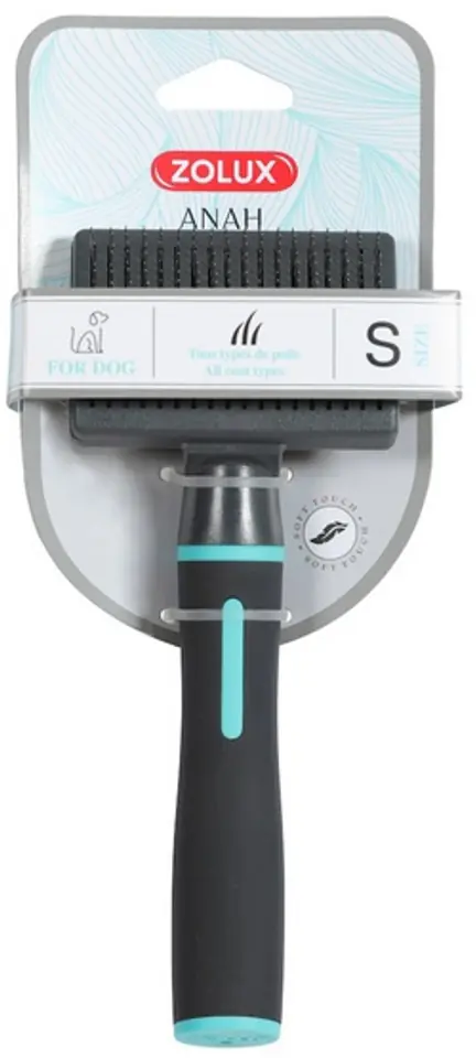 ZOLUX ANAHPrezentujemy nową, kompletną gamę produktów do pielęgnacji ANAH, stworzoną w odpowiedzi na wszystkie potrzeby psów i kotów.Zaprojektowaliśmy nowy uchwyt, który zapewnia większą wygodę użytkowania i idealnie leży w dłoni, dzięki ergonomicznemu kształtowi, miękkiemu i przyjemnemu w dotyku wykończeniu SOFT TOUCH oraz powłoce z gumy termoplastycznej i miękkim wypustkom. Dodatkowo, niezależnie od rozmiaru produktu, uchwyt ma jeden rozmiar, który idealnie leży w dłoni.Produkty zaprojektowano w nowoczesnym stylu, w modnych, stonowanych kolorach: dla psów w kolorach turkusu i antracytu, dla szczeniąt w kolorach turkusu i bieli, a dla kotów - w kolorach pudrowego różu i bieli. Harmonijne i dynamiczne kształty produktów z pewnością przypadną do gustu użytkownikom.Jakość jest głównym atutem nowej kolekcji produktów do pielęgnacji ANAH. Produkty wykonane są z tworzywa ABS, które jest szczególnie odporne na upływ czasu. Umieszczony pomiędzy rękojeścią a główką szczotki pierścień z gumy termoplastycznej sprawia, że produkt stabilnie leży w dłoni. Wszystkie metalowe elementy, tj. ostrza, zęby i wypustki, wykonano ze stali nierdzewnej.SZCZOTKA Z WYSUWANYMI IGŁAMI MAŁAElastyczne, zakrzywione igły umożliwiają delikatne szczotkowanie podszerstka. Dzięki wysuwanym igłom szczotka jest wygodna w użyciu i łatwa do utrzymania w czystości. Rozczesuje, usuwa martwy podszerstek i wygładza sierść.Szczotka z wysuwanymi igłami jest odpowiednia do wszystkich rodzajów sierści.Wymiary produktu: 75 x 50 x 185 mm