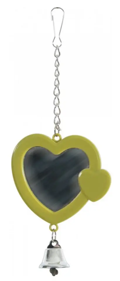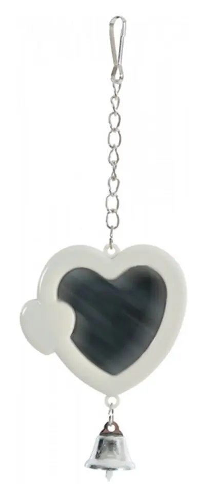 Lusterko serce na łańcuszku z dzwonkiemLusterko w kształcie serca na łańcuszku to idealny dodatek do klatki dla ptaków. Dzięki praktycznemu karabińczykowi, lusterko można przymocować do prętów klatki w dowolnym miejscu. Ozdobny dzwoneczek dodatkowo przyciąga uwagę zwierzęcia. Zabawka ta nie tylko dostarcza zwierzęciu rozrywki, ale także stymuluje je intelektualnie i urozmaica przestrzeń klatki.Lusterko pod względem kolorystycznym jest kompatybilne z klatkami z gamy Arabesque, ale sprawdzi się również w innych modelach. Farba wykorzystana przy produkcji zabawki jest nietoksyczna i bezpieczna.