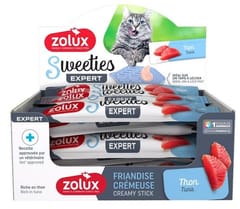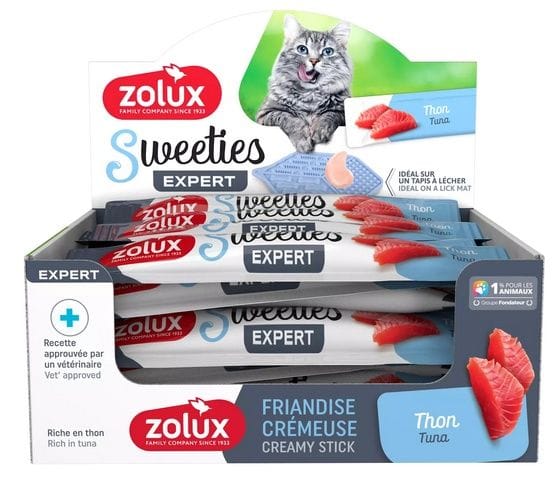 Zolux Sweeties Kremowy przysmak dla kota z tuńczykiemSweeties to apetyczny, kremowy przysmak dla kotów, który stanowi idealne uzupełnienie codziennej, zbilansowanej diety. Wilgotna przekąska z dużą zawartością tuńczyka pomoże kotu w utrzymaniu odpowiedniego poziomu nawodnienia, a do tego jest bogata w proteiny i uboga w tłuszcze. Produkt nie zawiera sztucznych barwników czy aromatów i jest bez dodatku cukru.Rekomendowane dawkowanie to maksimum 5 tubek/dzień dla kota o masie ok. 4 kg. Podawanie takiej ilości smakołyku nie zaburzy równowagi w diecie zwierzęcia.Sweeties dostępne są w kilku wariantach smakowych. Idealnie nadają się do rozsmarowania na macie do lizania, ale można je podawać także w sposób tradycyjny: prosto do pyszczka lub do miski.