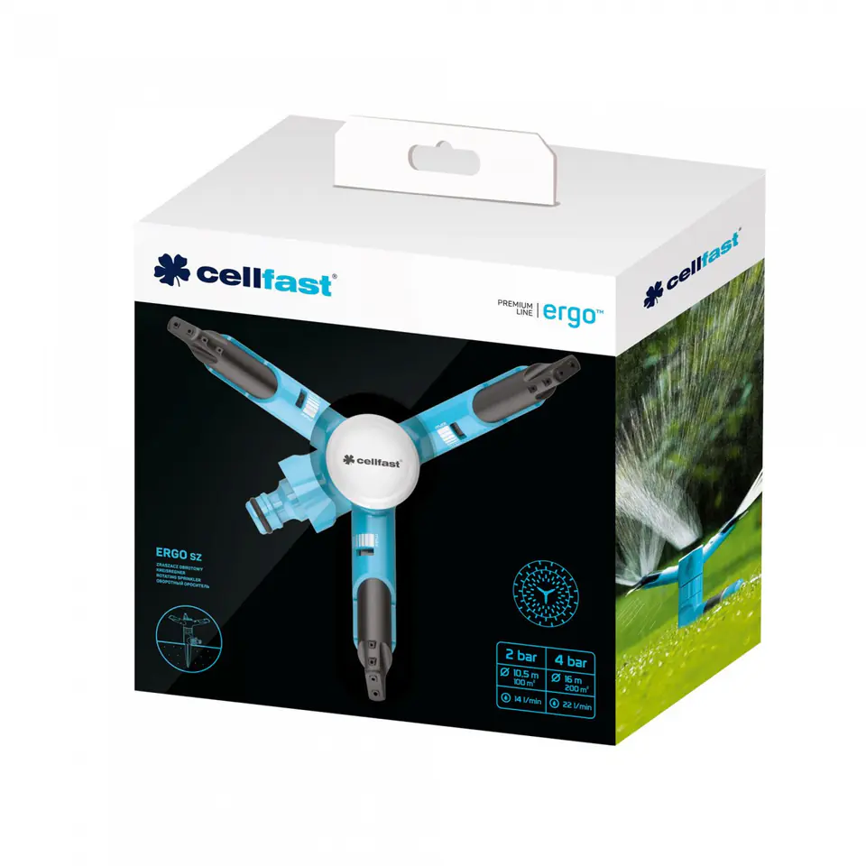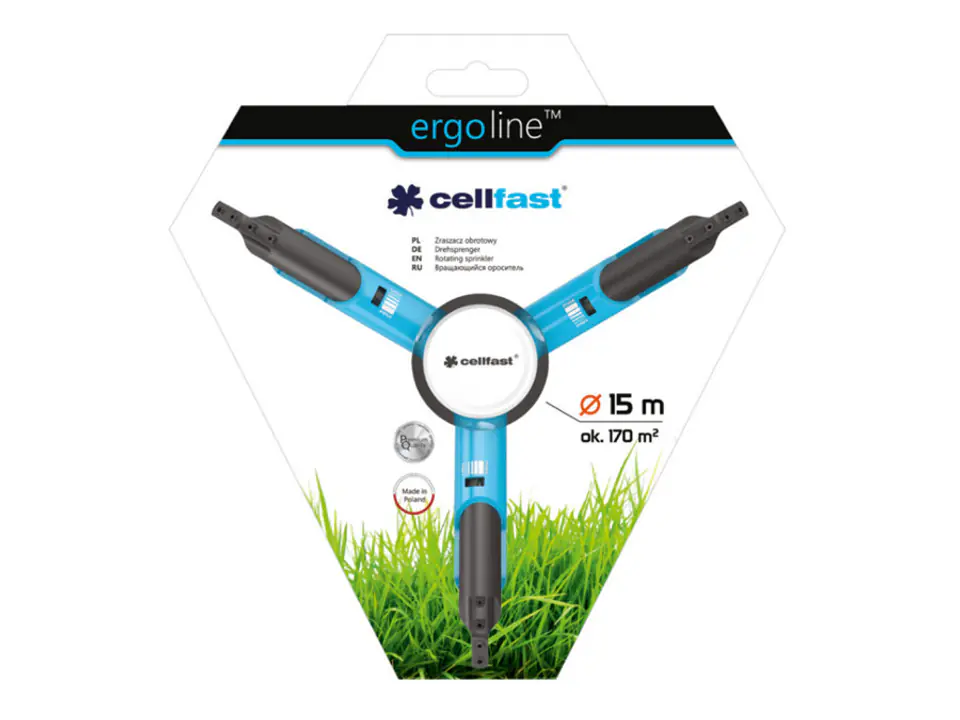 Zraszacz obrotowy trójramienny SZ ERGO jest funkcjonalnym urządzeniem z nowoczesnej linii Cellfast Ergoline. Montuje się go w ziemi za pomocą podstawy-szpilki. Równomierne nawadnianie trawnika zapewnia 12 otworów wylotowych.