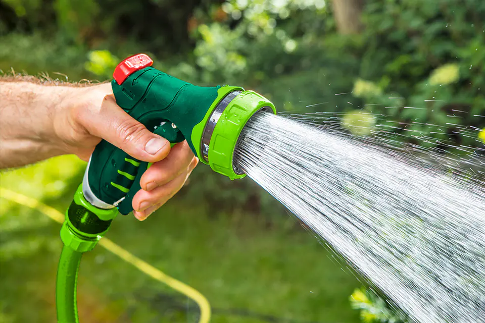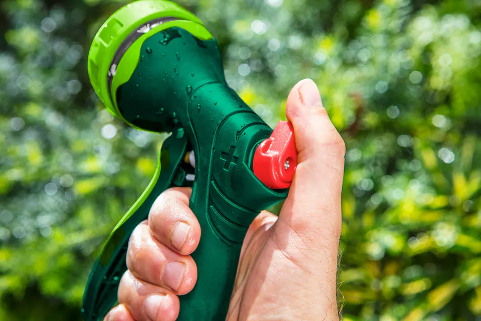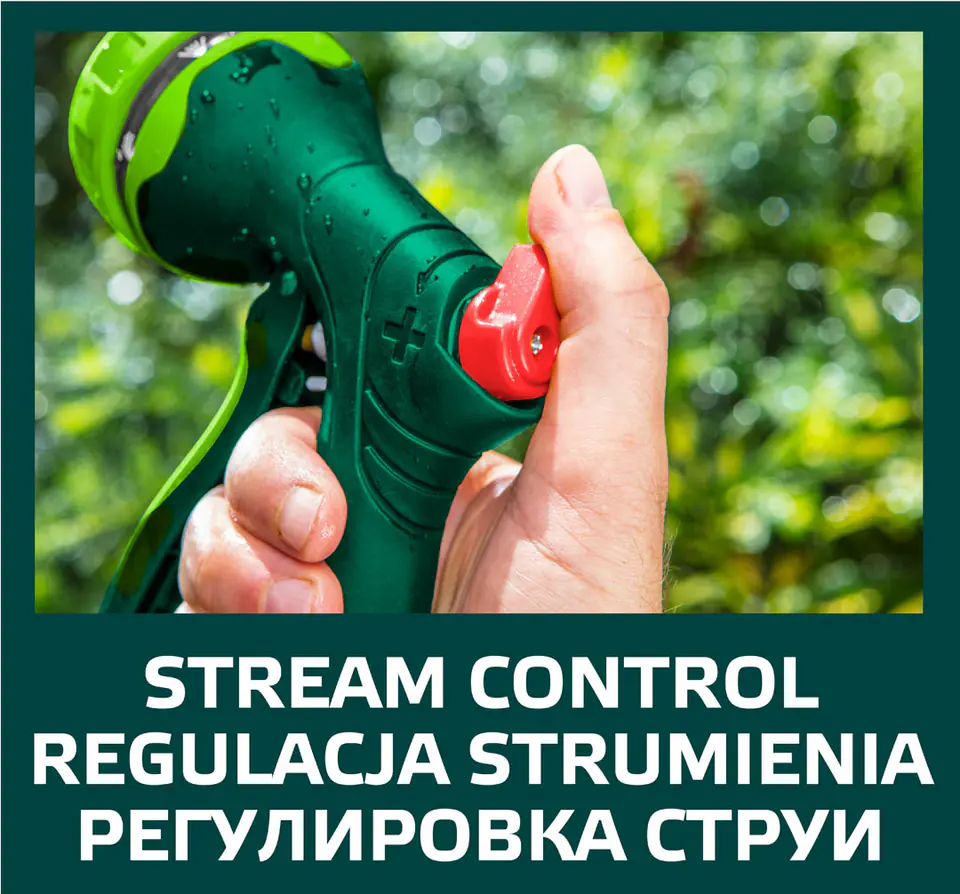 Zraszacz pistoletowy 7-funkcyjny, możliwość wyboru strumienia o różnej sile i funkcji, czytelne oznakowanie rodzaju strumienia, przednia dźwignia z blokadą, dwumateriałowy uchwyt
