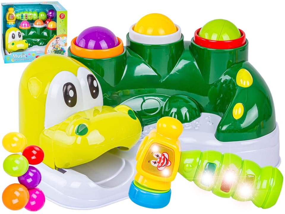 Zabawa jest bardzo prosta - polega na trafieniu w piłeczkę tak aby wbić ją w otwór. Piłeczka po zbiciu zjedzie zjeżdżalnią na sam dół - aż do pyszczka naszego wesołego krokodyla. Jest to świetny pomysł na ćwiczenie koordynacji wzrokowo-ruchowej.Różnokolorowe piłeczki przyciągają uwagę i zachęcają do zabawy. Każdy z otworów stawia delikatny opór, dzięki czemu piłeczki nie wpadają za szybko a dziecko musi dostosować siłę uderzenia.Zabawka jest idealna dla dzieci już od pierwszego roku życia. Wykonana została z wysokiej jakości plastiku z dbałością o wszelkie szczegóły.