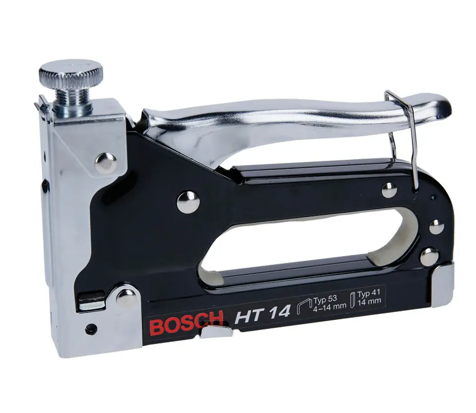 Wytrzymała konstrukcja wykonana całkowicie ze stali z bezstopniową regulacją siły uderzenia, wyłożona niecka rękojeści, blokowanie uchwytu. Uniwersalny zszywacz do tkanin, papy dachowej, folii, materiałów izolacyjnych, siatki drucianej, lekkich prac tapicerskich. Odpowiedni typ zszywek 53, długość 4, 6, 8, 10, 12, 14 mm. Odpowiedni typ sztyftów 41, długość 14 mm.