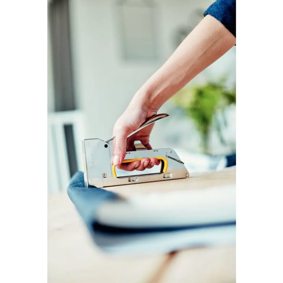 Wykonanie: Ze stali, łatwy w obsłudze, bez odrzutu, z dodatkowym magazynkiem dolnym, do lekkich prac. Zabezpieczenie uchwytu zapobiega niezamierzonemu zwolnieniu. Pojemność magazynka: 156 zszywek.
