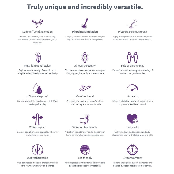 Poznaj model Zumio X Spirotip – innowacyjne urządzenie do punktowej stymulacji, stworzone z myślą o maksymalnej precyzji i komforcie użytkowania. Ten zaawansowany model został zaprojektowany przez kobiety, by sprostać najwyższym oczekiwaniom w zakresie funkcjonalności, ergonomii oraz bezpieczeństwa. Dzięki opatentowanej technologii Spirotip, końcowka urządzenia wykonuje szybkie, okrężne mikroruchy, umożliwiając skoncentrowaną stymulację wybranych obszarow ciała.