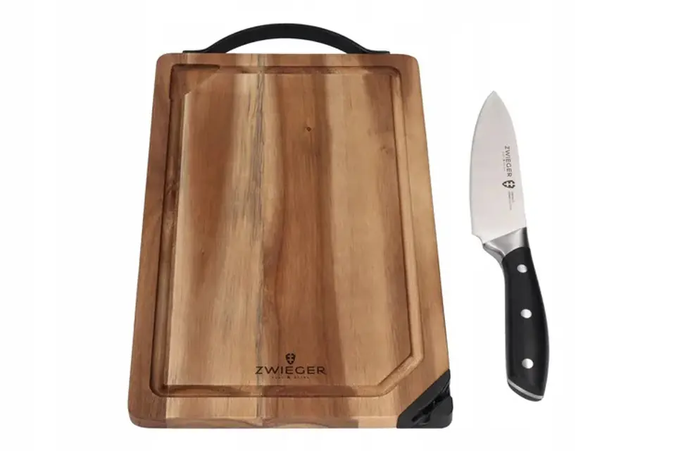 Deska akacjowa ZWIEGER OPTIMA z nożem i ostrzałką to praktyczny i elegancki zestaw, który doskonale sprawdzi się w każdej kuchni. Deska została wykonana z trwałego drewna akacjowego, które jest odporne na zarysowania i działanie wilgoci, co zapewnia jej długowieczność. Naturalne właściwości drewna sprawiają, że jest ono bezpieczne dla żywności i nie tępi ostrzy noży.W zestawie znajduje się wielozadaniowy nóż wykonany z wysokiej jakości niemieckiej stali nierdzewnej X50CrMoV15, który cechuje się twardością 54 HRC. Nóż posiada nitowaną rączkę z tworzywa ABS, co zapewnia pewny i wygodny chwyt. Dodatkowo, deska wyposażona jest w zintegrowaną ostrzałkę, co pozwala na szybkie naostrzenie noża bez konieczności używania dodatkowych narzędzi.Deska posiada praktyczny uchwyt do zawieszenia, co ułatwia jej przechowywanie i zapewnia łatwy dostęp podczas gotowania. Dodatkowe wgłębienie na obrzeżach deski zapobiega rozlewaniu płynów na blat, co jest bardzo praktyczne w codziennym użytkowaniu.